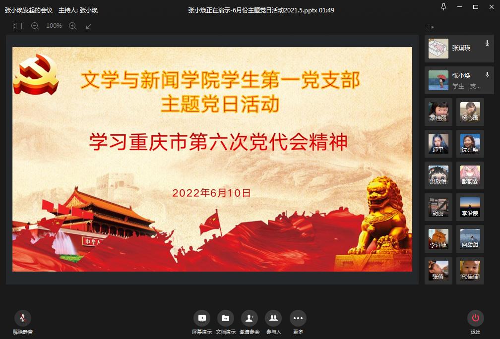 6月10日,学生一支部全体党员通过企业微信支部群深入学习重庆市第六次党代会精神,支部书记张小焕领学。