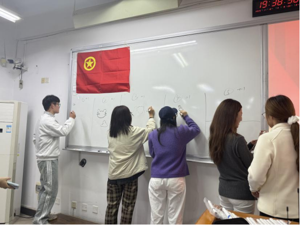 活动在轻松愉快的氛围中拉开序幕。同学们通过以“手印传情,共绘集体记忆”为主题的游戏环节化解隔阂、融入集体,他们用五颜六色的画笔在白板上留下五彩缤纷的手印和文字,错落有致的手印最终汇成一幅“集体同心”的艺术作品。值得一提的是,每位同学还获得了专属的“纪念版”文件袋,对班级的归属感、学院的亲密感在欢声笑语中生根发芽。紧接着,“默契比拼,点燃团队热情”“创意接力,解锁沟通乐趣”“你画我猜”“小鸡炖蘑菇”“放风筝”等趣味游戏让大家“脑洞大开”,现场笑声不断。