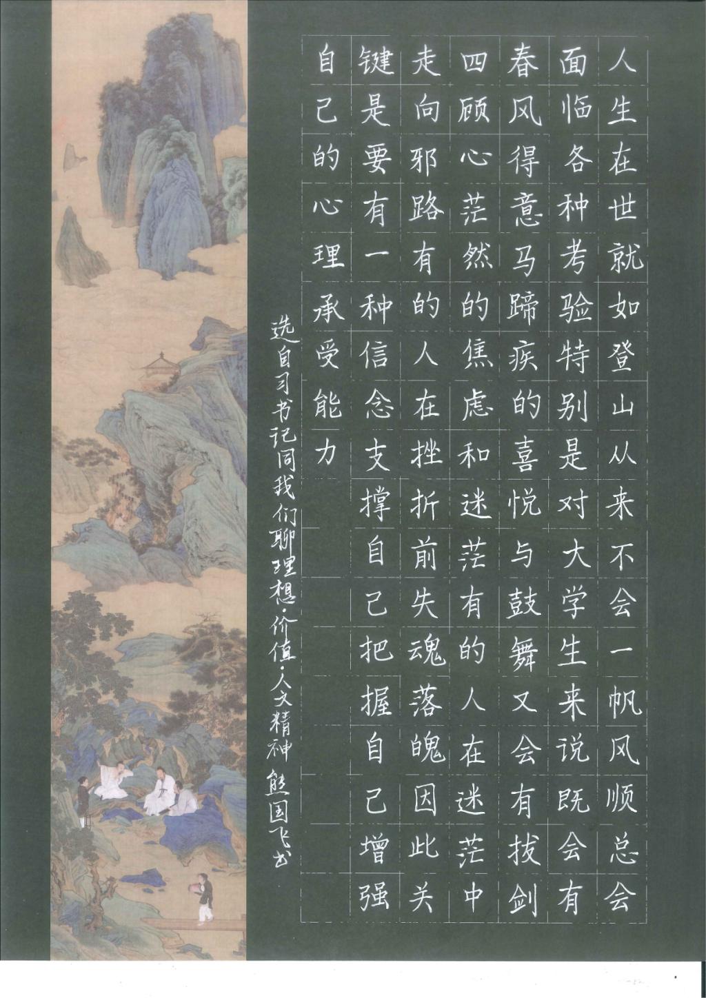 评:节选爱国、励志、求真、力行四个部分,用笔潇洒,流畅自然,给人雅逸之感,内容与结构展现知行合一。行书结体准确,笔法比较流畅,疏密得当。布局合理。