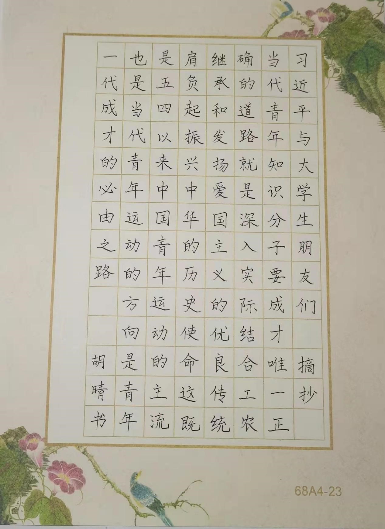评:下笔有力,字体美观,雄强俊秀,展现青年风华正茂之气。楷书间架精准,用笔圆润有力,有较好的粗细变化。整体美观。