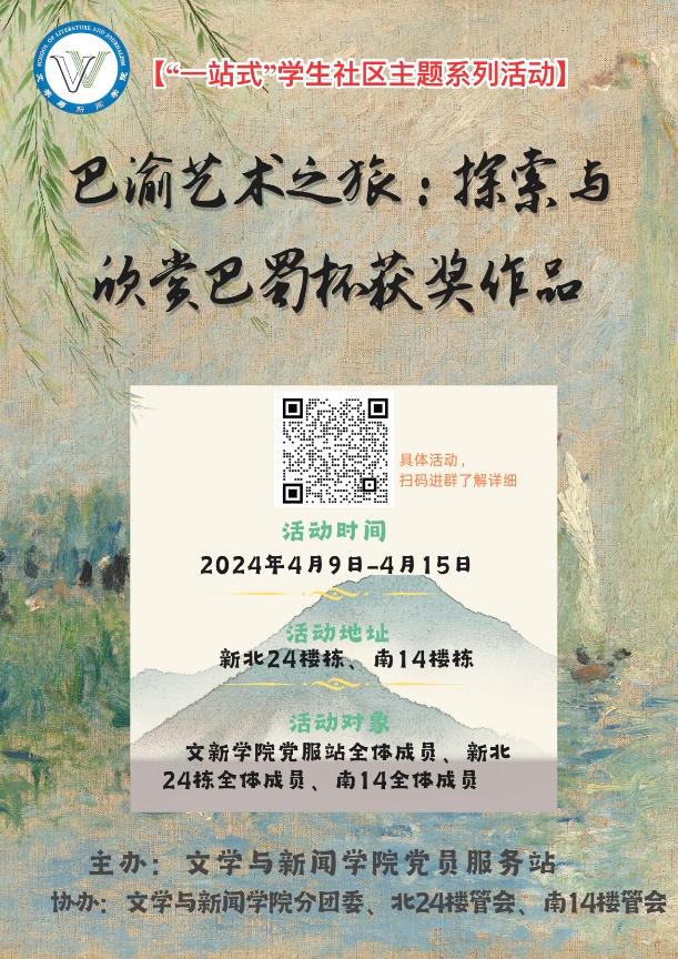 4月9日,由9428cn太阳集团古天乐开展的一场别开生面的“一站式”学生社区主题系列活动在重庆工商大学南岸校区新北24栋和南14楼栋宿舍楼下拉开帷幕。本次活动以“巴蜀艺术之旅:探索与欣赏巴蜀杯获奖作品”为主题,旨在展示巴蜀地区优秀的艺术作品,激发同学们对艺术的热爱与探索。