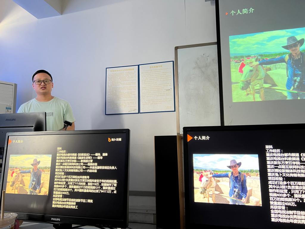 6月6日下午,2008级广播电视学校友梁科在我院传媒实训中心以“短视频”和“直播”为题,与2021级新闻与传播专硕班进行专业交流。梁科曾在10个月内为重庆新东方烹饪学院抖音官方号涨粉118万。