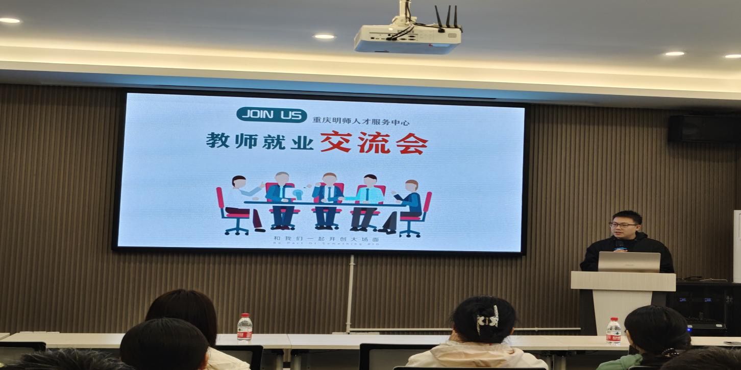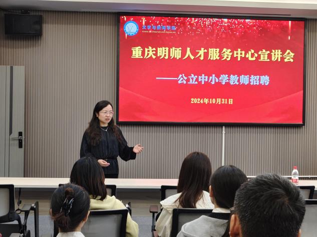 10月31日下午15时,重庆明师人才服务中心在慧智楼90529报告厅面向我校9428cn太阳集团古天乐、数学与统计学院和外国语学院毕业生开展“公立中小学教师招聘”宣讲会,文新学院党委书记潘焱、重庆明师人才服务中心董事长潘桂明、总经理卢帅等出席。