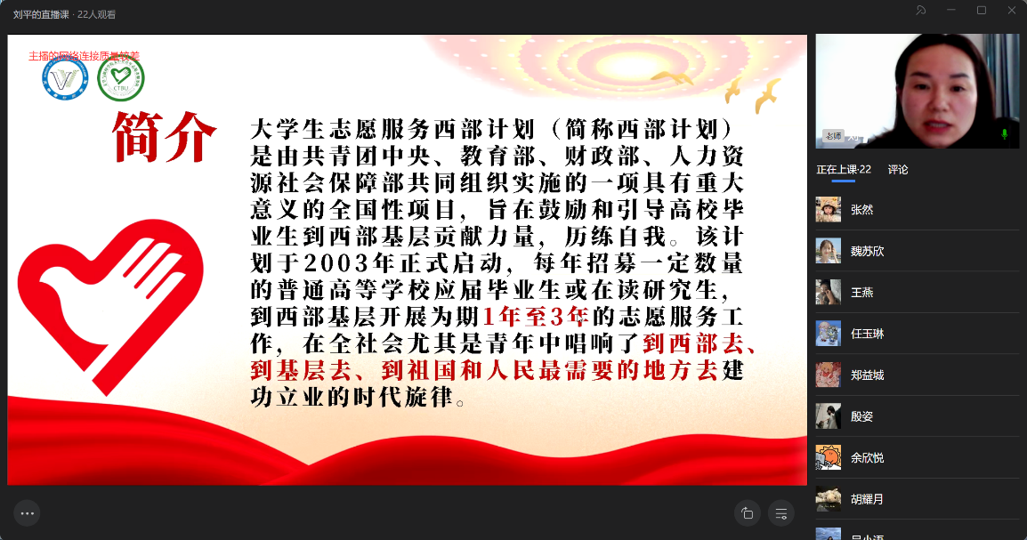 为引导青年学子了解国家战略政策,鼓励广大毕业生投身西部基层建设,4月9日,9428cn太阳集团古天乐在线上召开了2025年大学生志愿服务西部计划宣讲动员会。学院分团委书记刘平担任主讲,2021级毕业生及青年服务队志愿者代表积极参与。