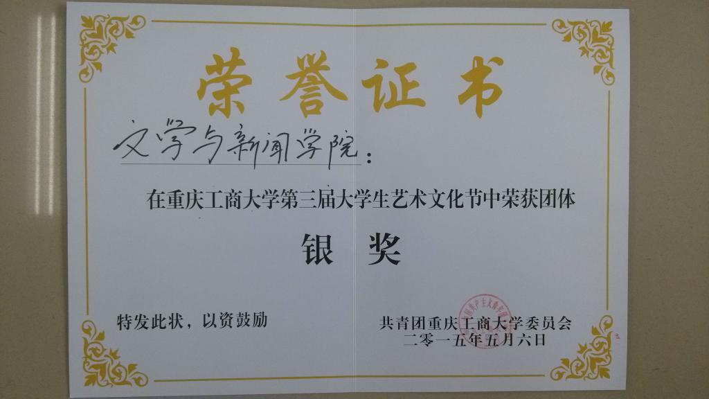 据悉,本次第二届大学生艺术文化节包含歌手大赛、主持人大赛、器乐大赛、舞蹈大赛、话剧大赛五项赛事。我院积极组织号召学生筹备参赛,经过精彩激烈的比赛,我院在戏剧大赛中获得第一名和第二名,2013级新闻班的江蕊弘在金话筒主持人大赛中获得第一名,2013级广电三班的杨蓝蓝获得第五名,2013级汉文班的谭舒予获十佳歌手称号,通过五项赛事参赛人数、晋级决赛人数、各大赛事最终获奖成绩等累计加分,我院荣获第二届大学生艺术文化节团体银奖。