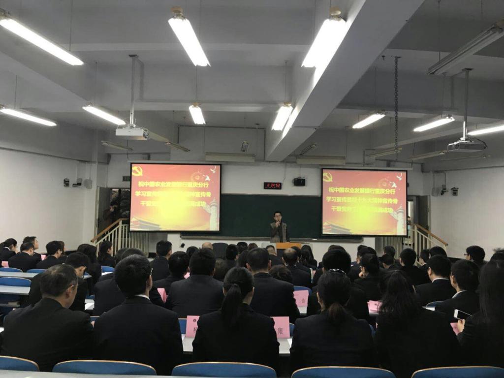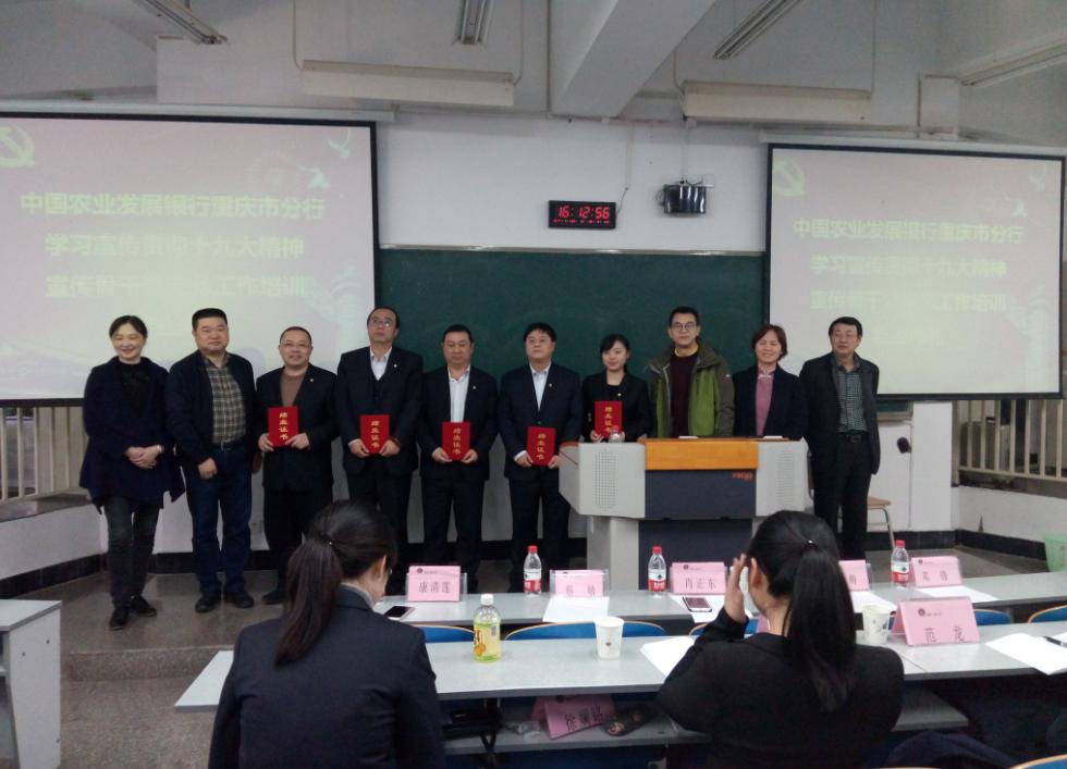 为宣传贯彻十九大精神,11月24日上午8:30,中国农业发展银行重庆市分行学习宣传贯彻十九大精神宣传骨干暨党务工作培训班在我校慧智楼90226正式开班。文新学院蔡敏院长、农发行重庆市分行领导向中胜在开班仪式上致辞。