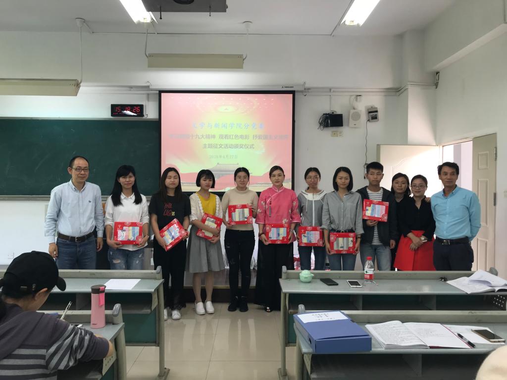 为深入学习贯彻十九大精神以及习近平新时代中国特色社会主义思想,推动全面从严治党向基层延伸,深入引导党员师生积极投身学习实践的热潮, 4月27日下午,文新学院分党委在慧智楼90625教室举行了“学习宣传贯彻党的十九大精神”主题征文颁奖典礼。文新学院分党委书记段庸生、分党委副书记李华平,全体分党委委员,以及学院5个党支部共计117名党员师生参加了活动。