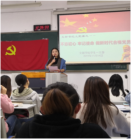 11月15日中午,文新学院学生一支部在90302教室开展了“不忘初心、牢记使命”专题党课活动,一支部全体党员参加了活动。