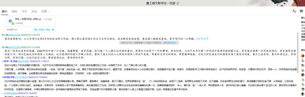 当前正处在疫情防控关键时期,为进一步深入学习贯彻习近平新时代中国特色社会主义思想,提高学生党支部的政治理论水平,在疫情期间响应“停课不停学”的号召,学生一支部于3月10日通过支部QQ群开展组织生活会暨政治理论学习活动。 按照学校党委组织部的要求,支部书记张小焕老师将此次政治理论学习的资料上传群共享,提出学习要求,并简单的介绍了此次学习的原因和目的,希望同学们通过学习坚定信心,同舟共济、团结一心,共同筑起抗击疫情的坚固防线,消灭病毒,赢得这场没有硝烟的战争!学生党员认真阅读,积极发言,其中17新闻一班程瑞同学结合《习近平总书记在统筹推进新冠肺炎疫情防控和经济社会发展工作部署会议上的讲话》的主要内容进行分享,总书记的讲话为我们做好疫情防控工作进一步指明了方向,注入了强大信心和力量,体现了党和国家的强大执行力,通过一批批的逆行者,感受到了灾难无情人间有爱;16新闻二班李清鑫同学从每个人都是“命运共同体”中的一环,提出我们都必须要重视此次疫情,以实际行动抵御病毒传播;16广电二班欧阳慧玲同学结合自身实际,提出不出门、在家学习就是为国家做贡献。