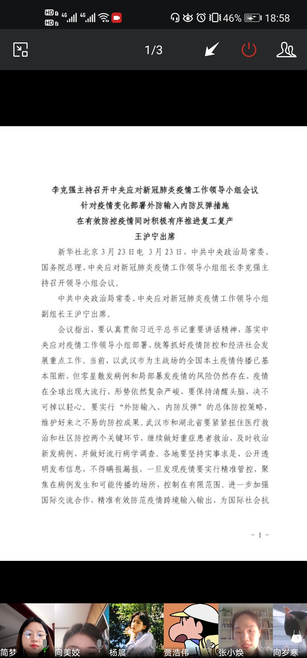 第二个议程是学生党员讨论发言。其中16广告班贾浩伟同学结合疫情期间自己所在村子的村长的喊话及站岗等行为,赞扬党的干部以身作则,不怕牺牲;17广电班简梦同学结合此次疫情当中牺牲的党员同志,分享党员不是一个“称谓”,而是一种沉甸甸的责任,全心全意为人民群众服务的责任;16新闻班夏秋菊同学从毕业生身份,结合自己找工作通过云招聘等方式,表示疫情当前,依然感受到了党对人民的关心,看似我们没有开学没有复工,但是所有的事情都在有条不紊的进行,相信疫情一定会过去,我们会早日回到美丽的校园。