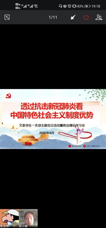 为进一步强化党员意识,4月17日,学生一支部召开“透过新冠肺炎疫情看中国特色社会主义的制度优势”主题党日活动暨政治理论学习会,因为疫情影响,此次活动采取网络形式进行,支部内全体党员参加。