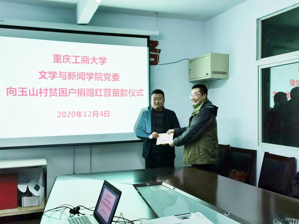 郁山镇玉山村驻村第一书记刘代成向大家简要介绍了村情、支部党建工作和脱贫攻坚成效。文新学院党委书记李华平代表学院党委表达了对玉山村精准扶贫及乡村发展的关心与支持,并将学院全体党员的自愿扶贫捐款6000元捐赠给了玉山村的贫困村民购买红薯秧苗。