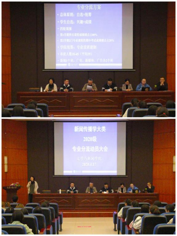 大会开始,张玉霞老师为现场的同学们介绍了出席本次大会的领导,并邀请院长王仕勇发言。王院长对新闻传播学大类专业分流方案进行了具体介绍,即坚持自选加统筹的原则,兼顾学生的兴趣和成绩,以及专业分流工作的基本流程。