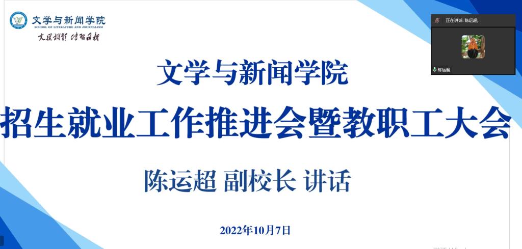 最后,学校常委、副校长陈运超作了总结讲话。陈运超副校长充分肯定了学院全体教职工在各自岗位上的辛勤付出,围绕“怎样认识学生?”“怎样有专业亮点?”“怎样实现学科间的交叉融合?”三个问题对学院下一步工作提出了新的要求:一是牢牢以学生为中心,以人才培养为出发点,贯穿于招生、就业工作中,砥砺学生品格,不断提高学生竞争力,培养社会和家长满意的大学生;二是打造专业亮点,通过专业建设、党团活动、学生培养,扩大专业的吸引力、影响力、显示度和贡献度,不断提升学科优势;三是持续推动学院专业特色发展,抓好学科间、教师间、专业间的交叉合作,走合力发展、学科间融合发展的道路。同时,陈运超副校长强调,全体教职工要深刻认识即将召开的党的二十大的重要性和重大意义,正确认识近期疫情防控工作的严峻形势,以昂扬奋进的精神状态,以实际行动迎接二十大的胜利召开。