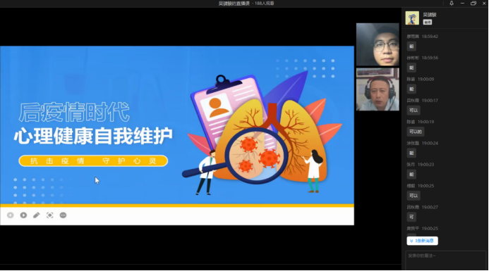 10月12日晚上7点,9428cn太阳集团古天乐特邀请到校心理卫生中心吴骕騻老师,在企业微信平台为我院学生开展了一场主题为“后疫情时代 心理健康自我维护”的心理健康讲座。