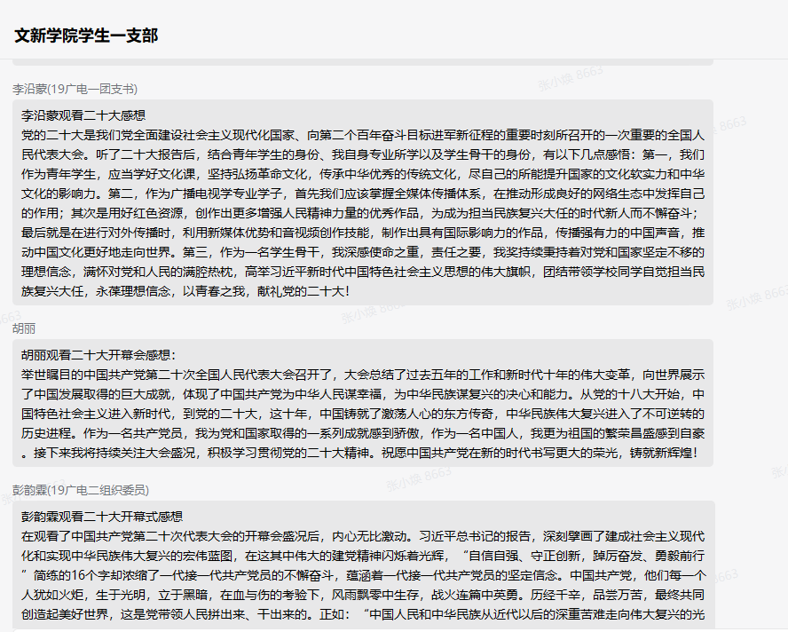 杨心语(支部党员,20新闻班同学):观看党的二十大开幕会,我深受鼓舞、倍感振奋、为国家的飞速发展而自豪。在开幕会的最后,习近平说:“青年强,则国家强……广大青年要坚定不移听党话、跟党走,怀抱梦想又脚踏实地,敢想敢为又善作善成,立志做有理想、敢担当、能吃苦、肯奋斗的新时代好青年,让青春在全面建设社会主义现代化国家的火热实践中绽放绚丽之花。”作为当代新青年,我们生在红旗下,长在春风里,我热爱我的祖国,也热爱中国共产党。我们确实生逢其时,我定当时刻严格督促自己,以良好的精神面貌去践行大会精神,为全面建成社会主义现代化强国、实现第二个百年奋斗目标添砖加瓦。主动担负起新时代新使命,以奋斗擦亮最亮丽的青春底色。