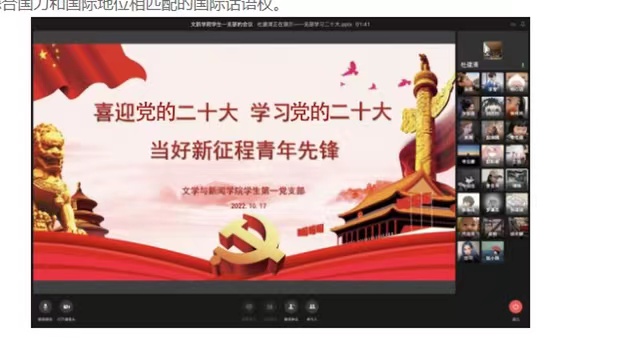 10月16日上午10时,举世瞩目的中国共产党第二十次全国代表大会在人民大会堂隆重召开。文新学院学生第一党支部第一时间组织师生观看本次会议直播,共同聆听习近平总书记的重要报告。会后,支部召开“喜迎党的二十大 学习党的二十大 当好新征程青年先锋”组织生活,师生就会议内容开展集体讨论学习,积极发表自己的看法和感想。支部委员杜建清老师主持会议。
