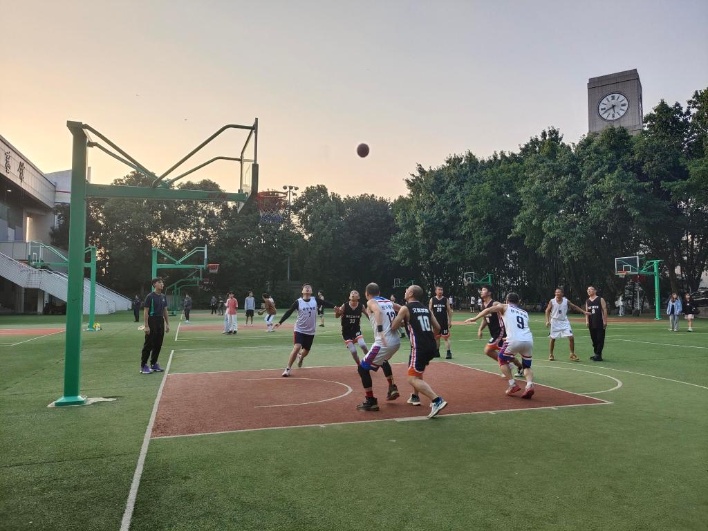 第一场比赛开始之前,学院代表队的老师和同学们激烈地展开战术讨论,裁判们有条不紊进行准备工作以确保比赛的有序开展。随着裁判的一声哨响,比赛开始,整个篮球场内充满了紧张的气氛。各位队员全力以赴,积极防守,猛烈进攻,越战越勇。文新学院各队员间接球、传球、抢球、投篮等一系列动作配合默契十足。