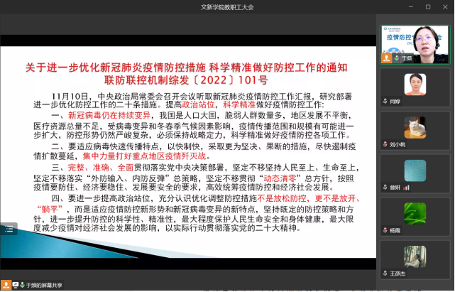 为深入贯彻落实疫情防控工作要求,做好当前疫情防控工作,11月14日晚上,我院以线上会议方式召开疫情防控专题培训会,学院领导班子成员、全体教职工参会。会议由学院党委书记于频主持。