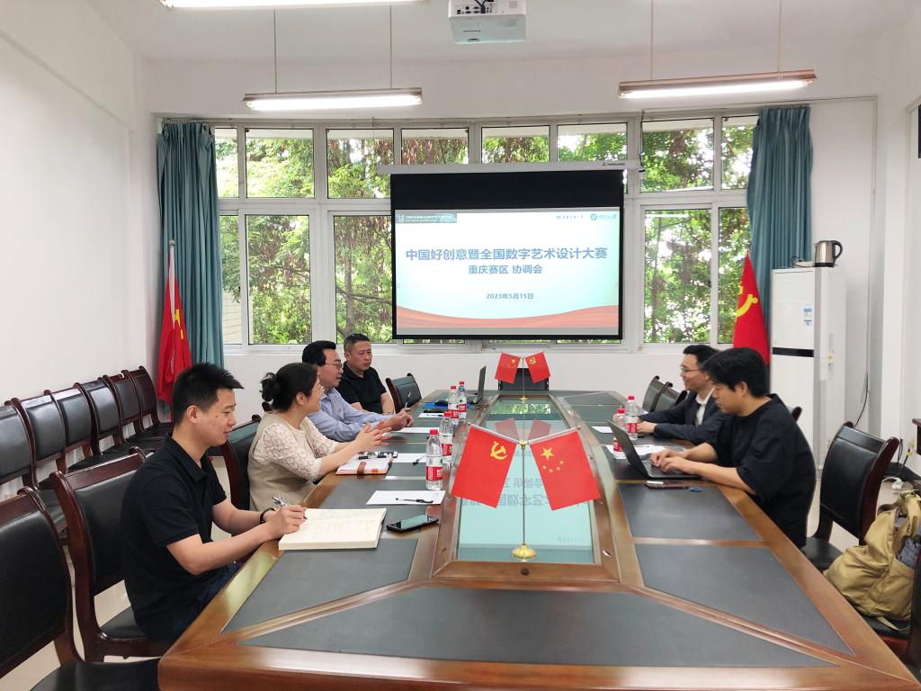 2023年5月15日上午,中国好创意暨全国数字艺术设计大赛重庆赛区协调会在9428cn太阳集团古天乐90528会议室召开。9428cn太阳集团古天乐于频书记、殷俊院长、程元元副书记、李琦老师,重庆交通大学艺术设计学院(马蒂亚斯国际设计学院)李伟湛副院长、刘飓涛老师共同出席协调会。