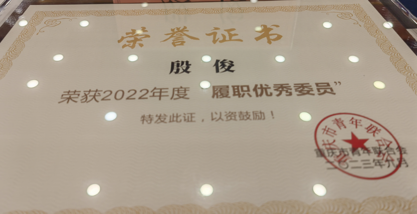 重庆市青年联合会开展了表彰2022年度优秀会员团体、履职优秀界别工作委员会和履职优秀委员的推选活动,共有14个团体、6个界别工作委员会、103位个人获奖。我院院长殷俊教授荣获“2022年度履职优秀委员”荣誉。