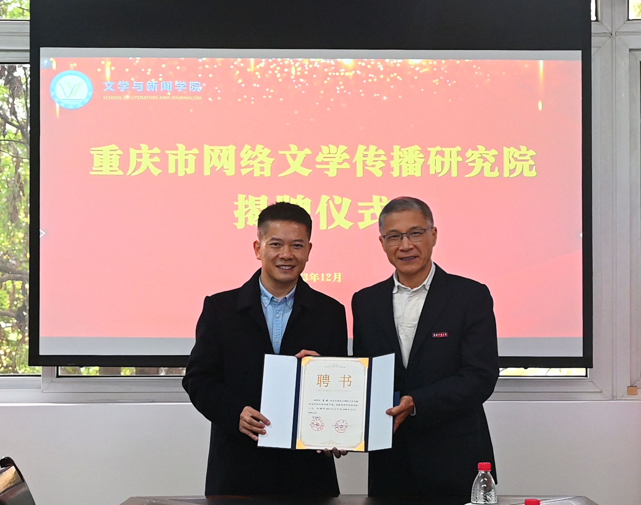 陈运超副校长为袁锐主席颁发重庆市网络文学传播研究院院长聘书