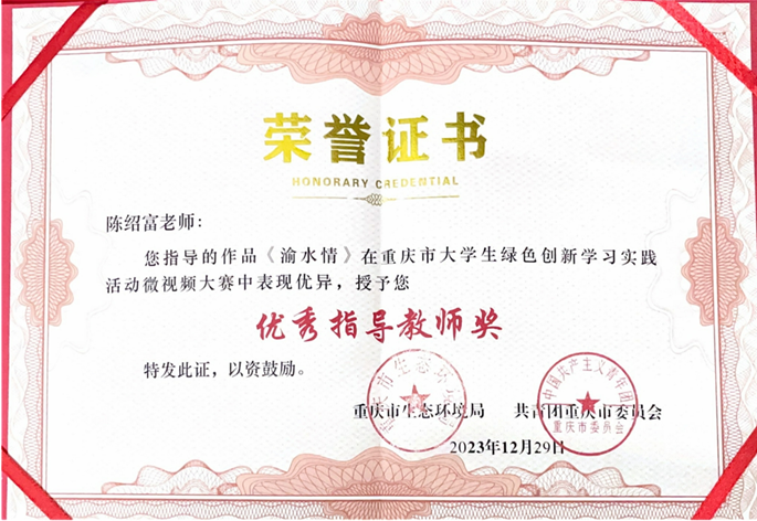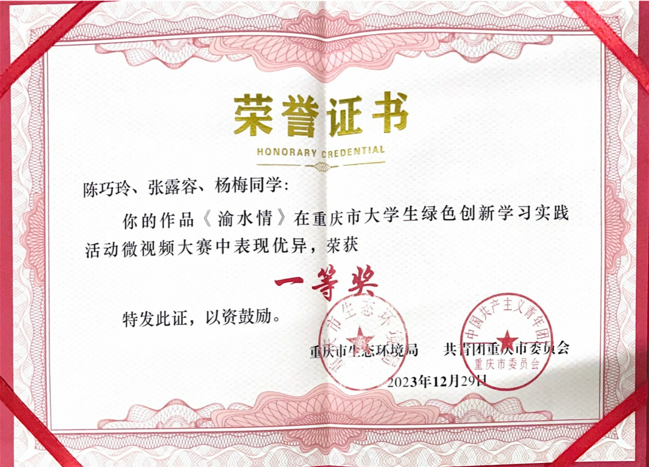 近日,重庆市大学生绿色创新学习实践活动微视频大赛传来喜讯,9428cn太阳集团古天乐学生陈巧玲、杨梅、张露容在陈绍富老师指导下创作完成的短视频《渝水情》荣获大赛一等奖。