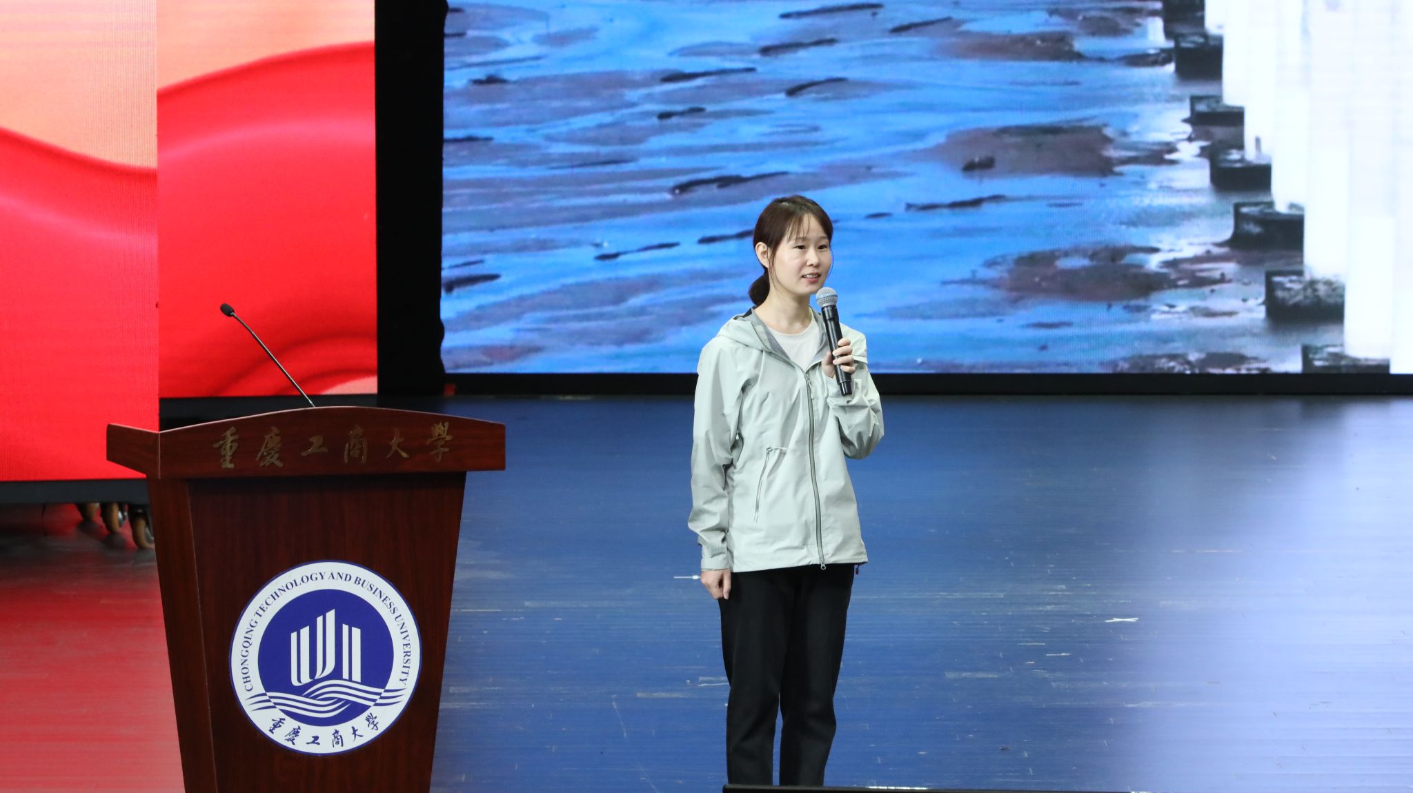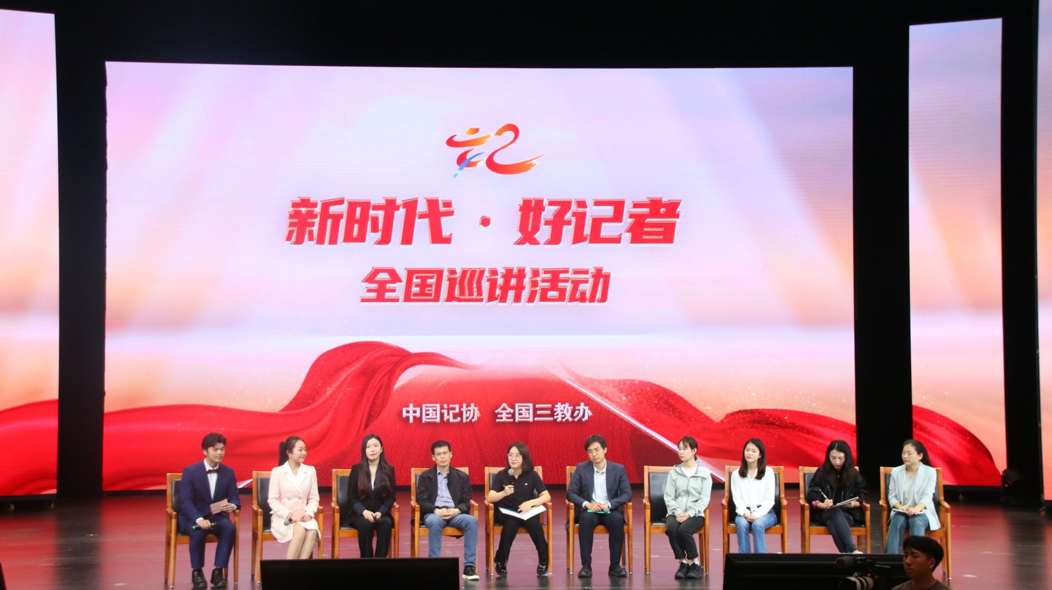 在报告会环节,高文成、田佳佳、赵洪潭、牛宇琦、王文志、游凯、张素、熊捷8位记者分享了他们亲历亲见亲闻亲为的新闻故事,为师生带来了一场催人奋进、感人泪下、热血激昂的巡讲报告。