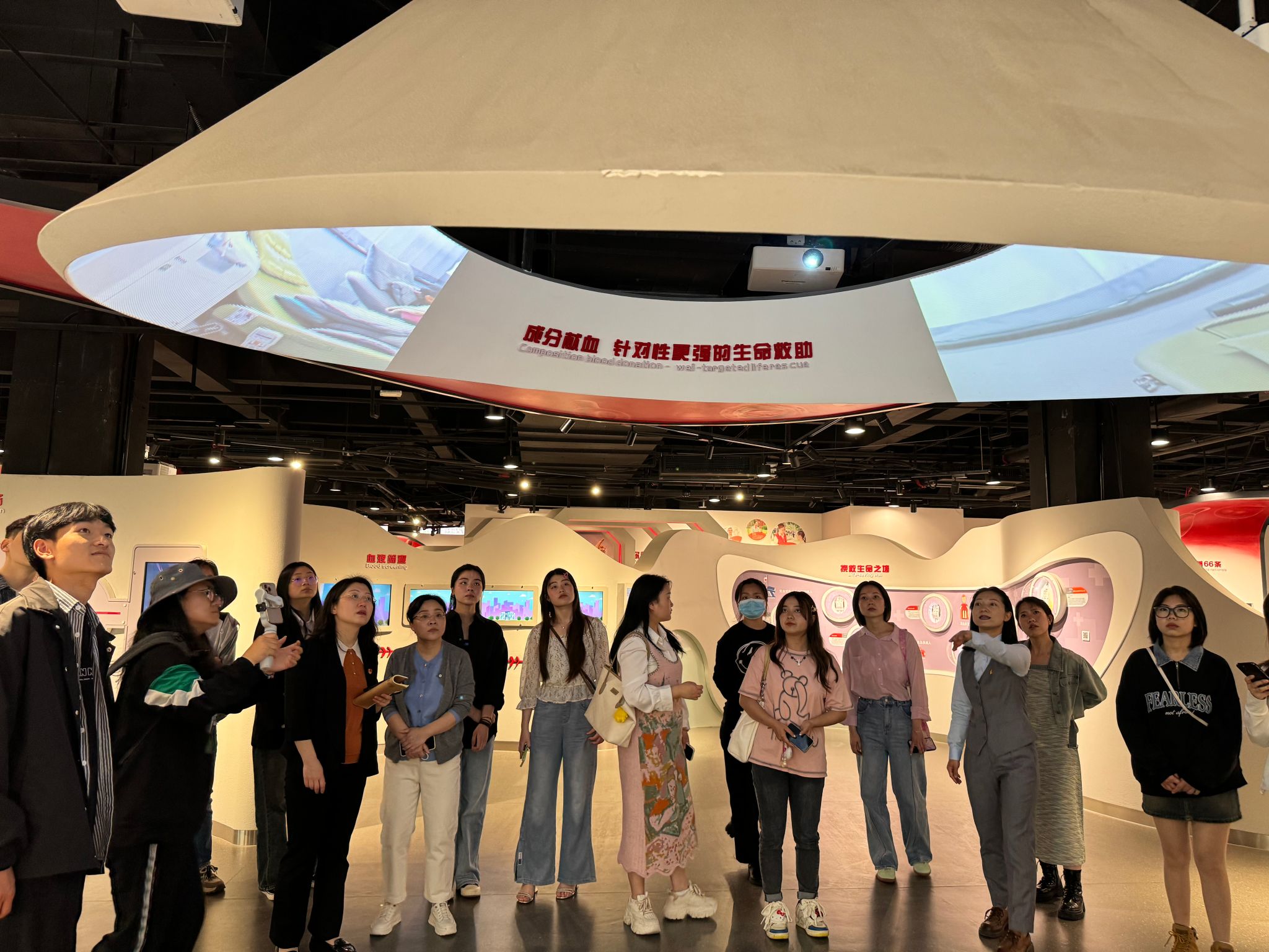 师生们首先参观了重庆市血液中心无偿献血健康教育馆。展馆的讲解人员先后从血液生理、血型科普、采供血、公益人文和利他主义等五个板块,利用240度环屏、全息投影等先进技术,为师生们进行了全面生动的科普。同学们通过有趣的互动式参与体验,学习了血液构成及功能等基础血液科学知识。