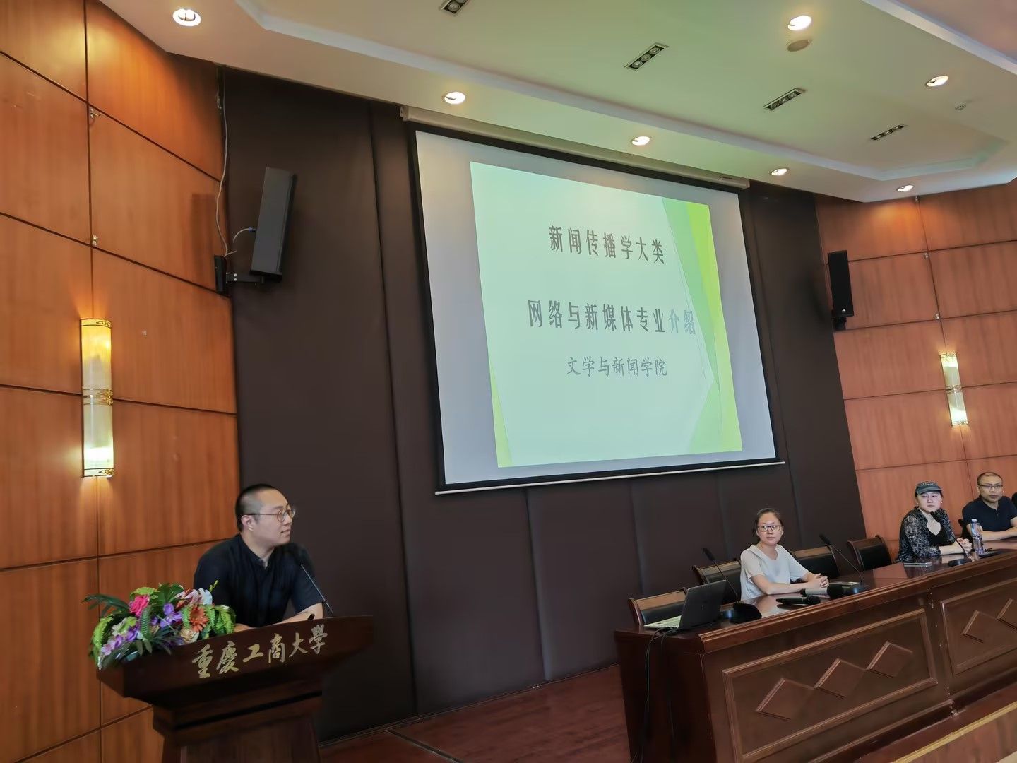 姚琦首先从历史沿革、培养目标、课程设置、专业特色介绍了网络与新媒体专业的基本情况,从政策导向、社会需求两个方面分析了网络与新媒体的发展前景。廖宇翃向同学们阐明了国家对新闻学的改革方案、专业的历史沿革、专业特点、特色课程及培养目标,毕业去向等。王凌峰对广告学的专业发展前景、专业课程设置和毕业就业去向进行了说明。谈华伟主任对广播电视学专业的研究领域、专业发展前景、办学条件,并鼓励同学们树立远大志向,投身专业学习,通过大学四年的不懈努力,以优异的成绩开启新的人生篇章。