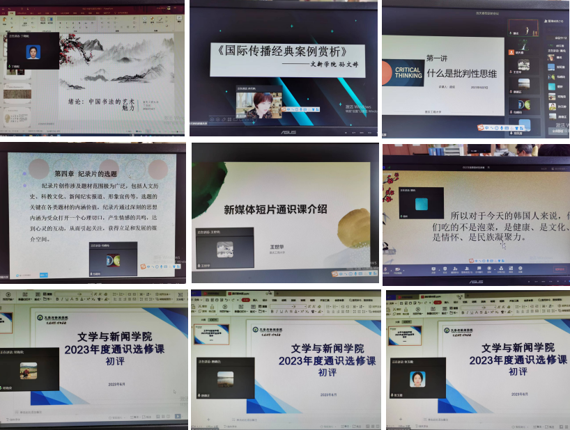 通识选修课是我校人才培养与课程建设的重要组成部分,我院已建成通识选修课13门,其中多门课程深受学生喜爱。为突显学校“商工融合、文理交叉”的人才培养目标,建构体现“中国特色”“中国底蕴”、商工融合、文理交叉、结构合理、满足学生需要的多元化通识教育课程体系,根据学校《关于开展2023年度新开通识选修课申报工作的通知》,我院包晓玲、王世华、谭成、丁晓妮、曾妍、孙文婷等6名教师申请新开《纪录片创作与鉴赏》《自媒体创业与运营》《优秀新媒体短片赏析 》《批判性思维训练》《书法临习与鉴赏》《韩国影视与文化》《“讲好中国故事”优秀案例赏析与评鉴》等7门课程。为确保申报课程质量,我院于2023年6月9日举行了线上试讲,试讲由教学副院长郑笑眉主持,校级督导专家邓海荣、唐德正和院级督导专家张玉霞担任评委。