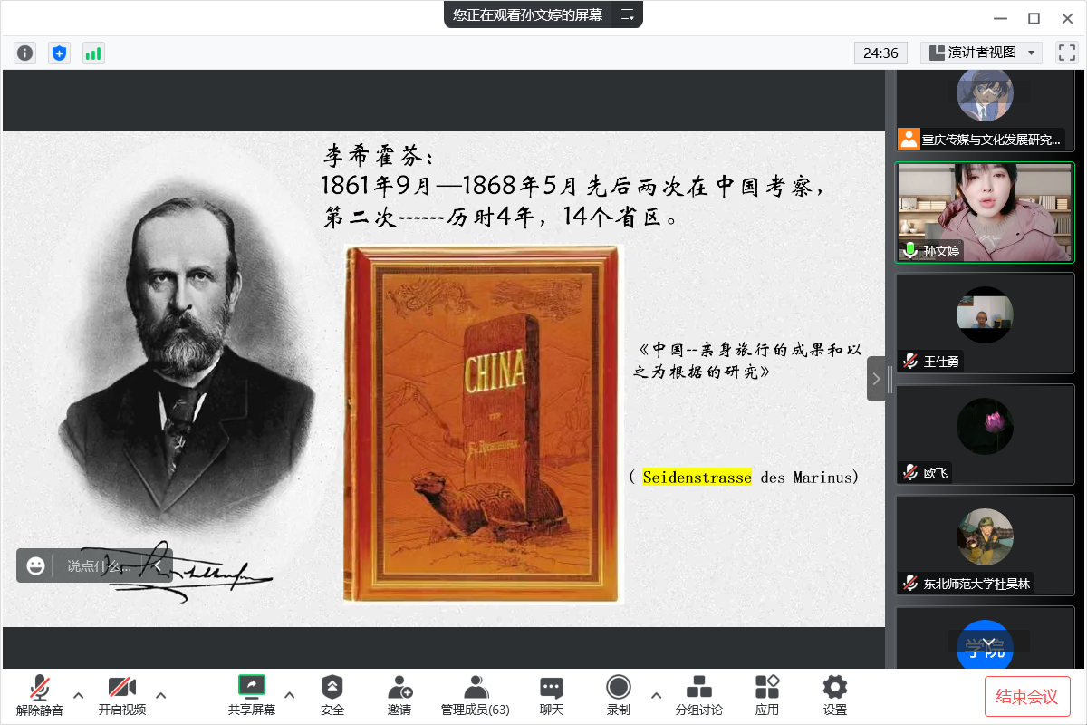 孙文婷博士从概念史的研究、概念史研究跟其余史学研究的关系、中国学界的概念史研究现状、“丝绸之路”的概念源起及早期传播和“丝绸之路”在中国的传播与文化认同五个方面展开。从“丝绸之路”概念在中国经历的从外来的接引,到中国学界的质疑、认同,以及通过史学与考古的互证,最终形成的话语体系并进行对外传播这个过程。这个议题重新审视了古代中国与外部世界的关系,是从中国的主体性来理解中国史与世界史这种欧亚空间的转向。