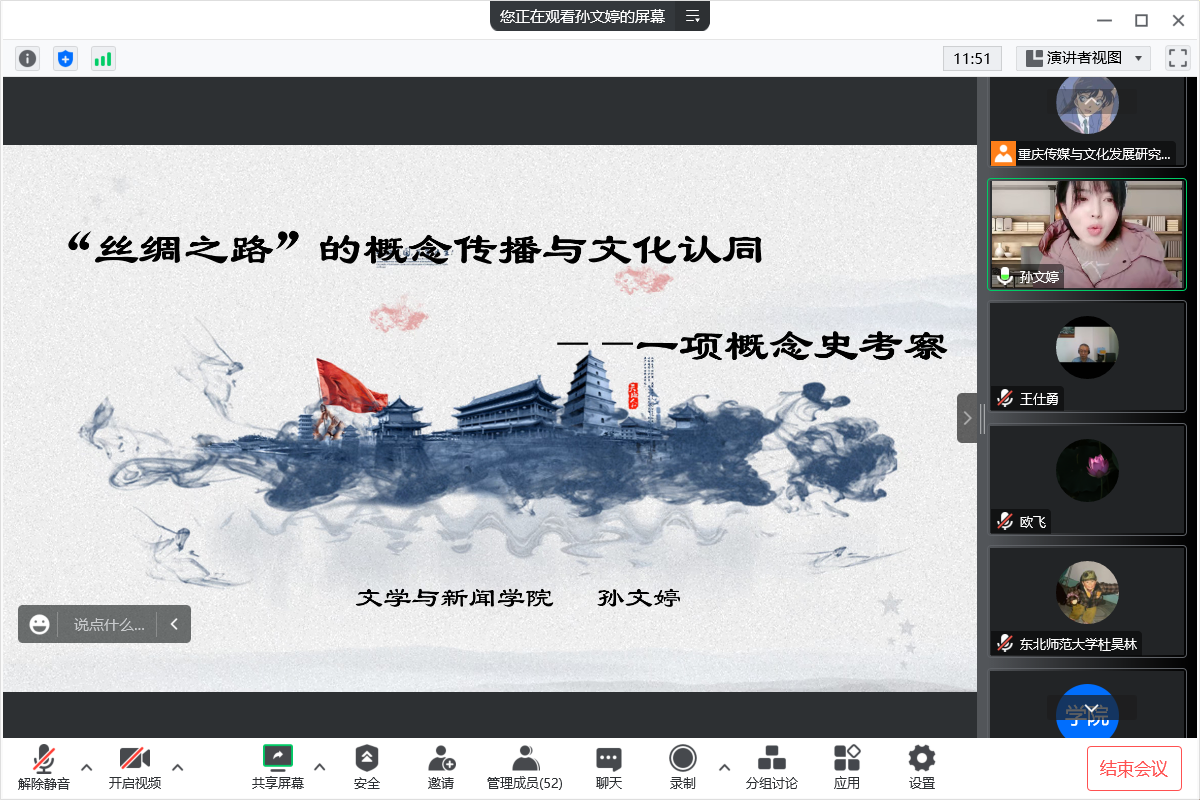 12月23日下午,9428cn太阳集团古天乐与重庆传媒与文化发展研究中心在腾讯会议平台进行了第六期传媒与文化学术沙龙。本次学术沙龙邀请了孙文婷博士分享《“丝绸之路”的概念传播与文化认同》,学院青年教师及新闻传播学研究生参加了此次学术沙龙,沙龙由院长王仕勇主持。
