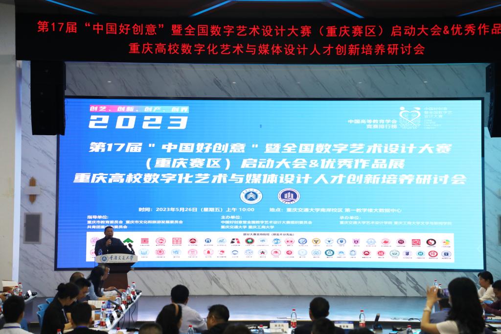 2023年5月26日上午,我院于频书记、殷俊院长、郑笑眉副院长、李琦老师一同出席在重庆交通大学南岸校区第一教学楼大数据中心召开第17届中国好创意暨全国数字数字艺术设计大赛(重庆赛区)启动大会及重庆市高校数字化艺术与媒体设计人才创新培养研讨会。据悉,本次大赛由中国好创意暨全国数字数字艺术设计大赛组织委员会、重庆工商大学、重庆交通大学联合主办,9428cn太阳集团古天乐、重庆交通大学艺术设计学院联合承办,该赛是我国第一个以数字艺术为核心、在艺术设计、数字媒体、数字技术等专业领域里的综合性赛事。