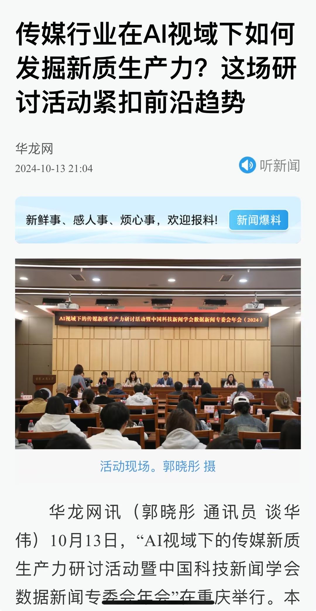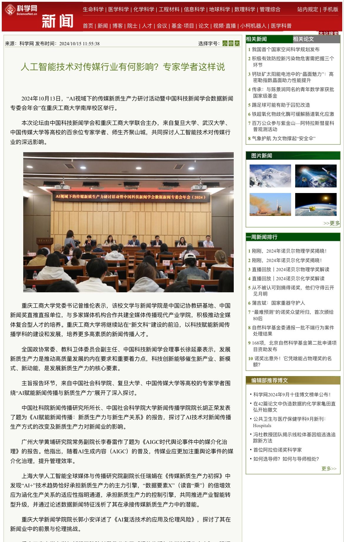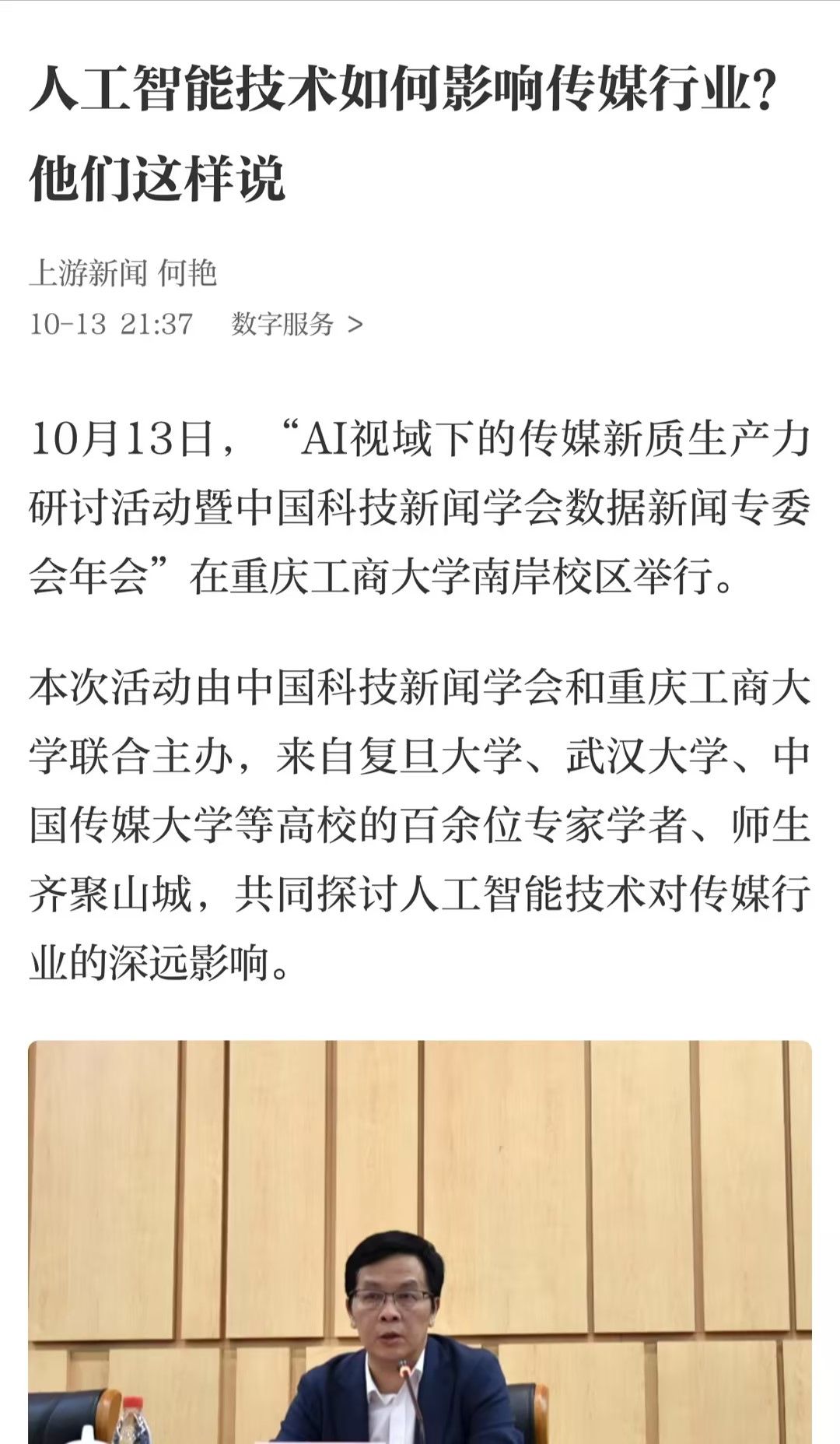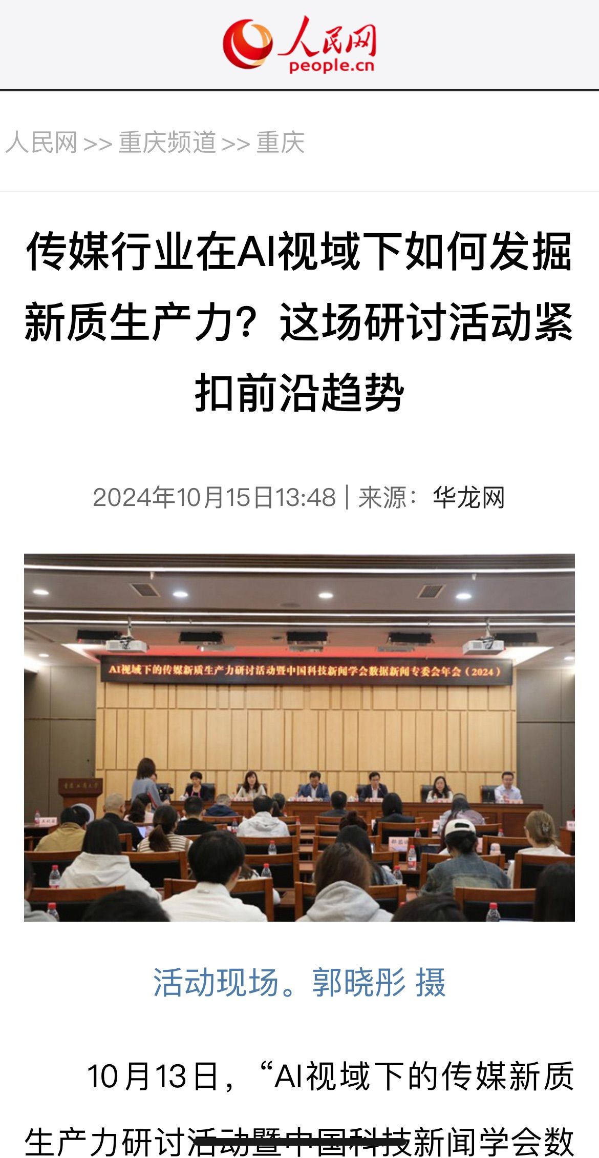 近日,人民网以《传媒行业在AI视域下如何发掘新质生产力?这场研讨活动紧扣前沿趋势》为题;科学网以《人工智能技术对传媒行业有何影响?专家学者这样说》;重庆电视台以《专家齐聚山城 探讨AI技术在新闻传播中的应用与发展》;华龙网以《传媒行业在AI视域下如何发掘新质生产力?这场研讨活动紧扣前沿趋势》为题;上游新闻以《人工智能技术如何影响传媒行业?他们这样说》为题;光明网以《中国科技新闻学会数据新闻专委会年会在重庆举行》为题;人民政协报以《“AI视域下的传媒新质生产力研讨活动暨中国科技新闻学会数据新闻专委会年会”在重庆举行》为题分别报道了10月13日我校召的“AI视域下的传媒新质生产力研讨活动暨中国科技新闻学会数据新闻专委会年会”。