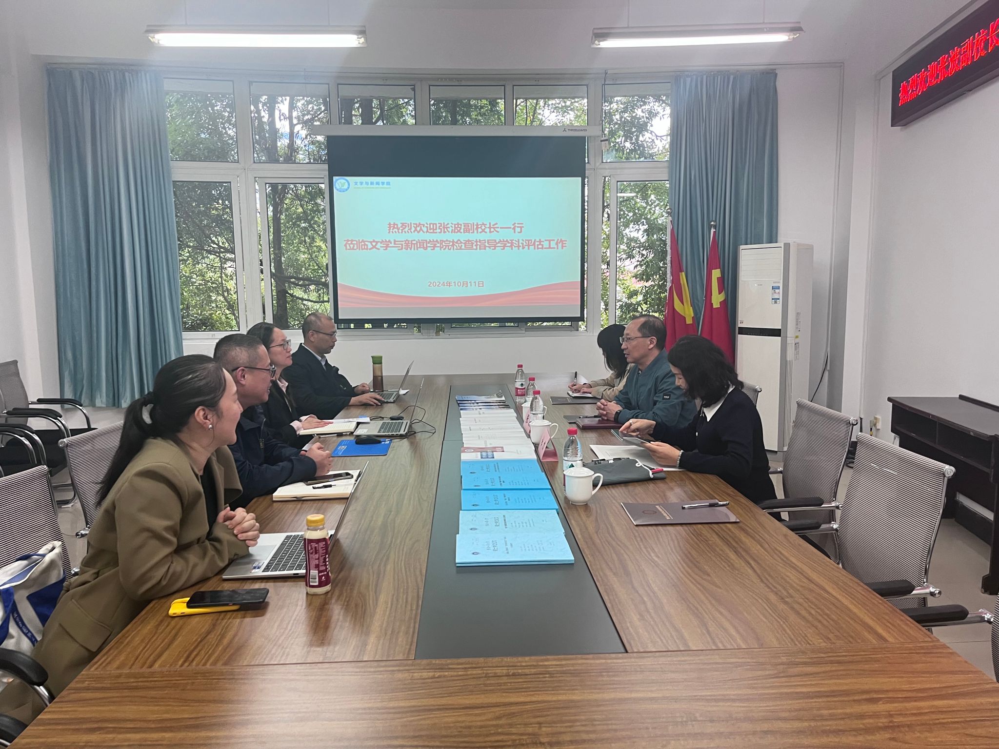 10月11日下午,学校党委常委、副校长张波带领研究生院院长杜力、发展规划处学科建设科科长李英娇一行,到9428cn太阳集团古天乐检查指导新闻传播学学位点周期性合格评估自评工作。学院党委副书记程元元、副院长郑笑眉及评估专项小组成员参会。