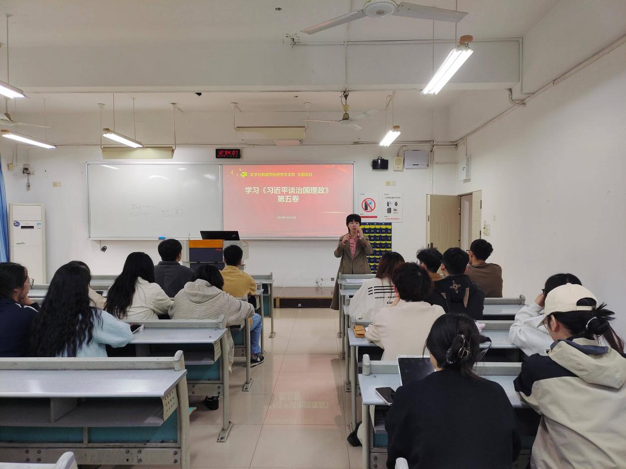 在主题党日活动中,支部对照《2025年10月党支部主题党日指导性计划》要求,以“学习《习近平谈治国理政》第五卷”为核心主题展开议程。活动伊始,周晋带领全体党员聚焦“坚持人民至上”“统筹发展和安全”等与教育事业紧密相关的章节,结合学校“立德树人”根本任务解读核心要义,通过“原文领学+案例分析”的方式将理论内容与课堂教学、科研创新、学生管理等实际工作相结合。2023 级传播学专业党员杨喻茚发言称,受习近平总书记“人民至上”论述的启发,她关注到了独居老人的生活困境。她表示,作为一名新时代的好青年,自己将积极发挥专业优势,以青年视角、青春视野创作适老化传播内容、传递惠民政策,践行青年党员“把理念落到实处”的初心。