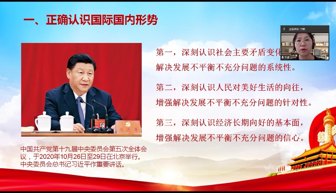 接着,党委书记于频领学了习近平总书记关于新发展阶段贯彻新发展理念必然要求构建新发展格局的重要讲话精神,围绕正确认识国际国内形势、全面把握新发展阶段、着力构建新发展格局、构建新发展格局要把握好几个重要着力点和提高党领导贯彻新发展理念、构建新发展格局的能力和水平等五个方面的内容进行了解读。她指出,在党的二十大即将召开之际,全体教职工要深入学习贯彻习近平总书记系列讲话精神,必须坚持正确的历史观、大局观、发展观,有深厚的信心和底气,有迎接机遇和挑战的准备,有“准确识变、科学应变、主动求变”的能力,为党育人,为国育才,以实际行动迎接党的二十大胜利召开。