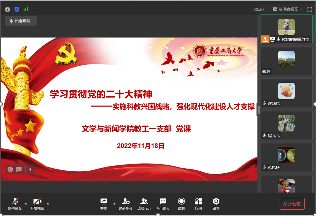 11月18日下午,文学与新闻学院教工第一党支部通过企业微信在线会议的形式,开展了学习贯彻党的二十大精神专题党课,由支部书记欧婧主讲,专题党课以党的二十大报告中的第五部分“实施科教兴国战略,强化现代化建设人才支撑”为主题,支部全体党员教师参加了党课学习。