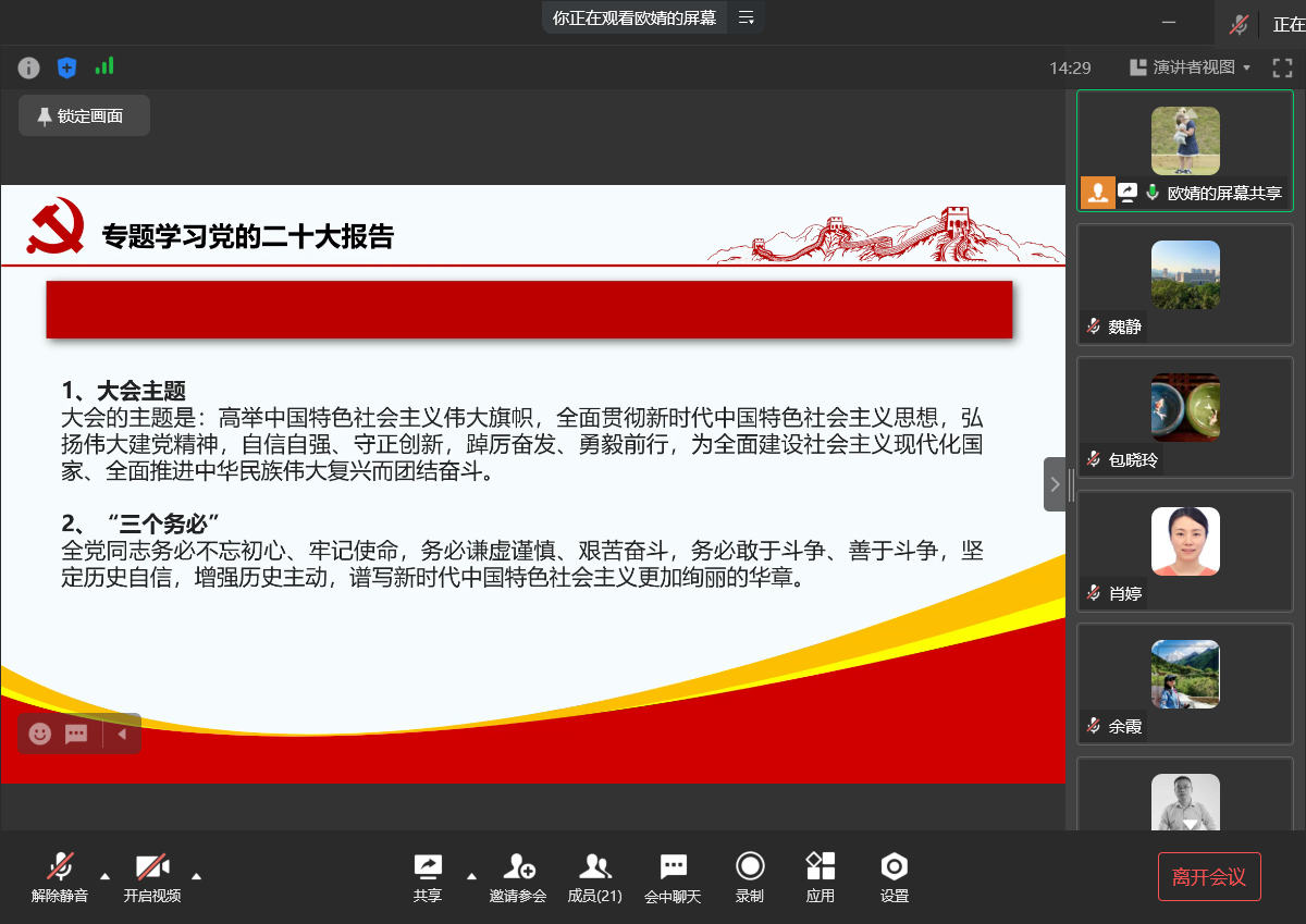 随后为开展好2022年度组织生活会与民主评议党员工作打牢思想基础,支部书记组织党员教师就党的二十大报告和《中国共产党章程》进行了专题学习。首先从大会的主题入手,集中学习党的二十大报告的重要内容,从“三个务必”“三件大事”“三个始终”“六个必须坚持”“一个基本点”“三个不动摇”“‘两步走’战略安排”“坚持‘三个第一’”“坚持‘四个面向’”“牢记‘五个必由之路’”等各方面要点进行专题学习。随后就《中国共产党章程》进行专题学习,先回答党的二十大为什么要修改党章这一疑问,即党章是党的总章程,党的全国代表大会根据理论创新和实践创新的需要对党章进行修改,是我们党的一个惯例。在党中央就党的二十大报告议题征求意见过程中,各地区各部门一致建议,对党章进行适当修改。随后学习党章修改的具体内容,即增写党百年奋斗的重大成就和历史经验的内容,充实完善习近平新时代中国特色社会主义思想的科学内涵和历史地位相关内容,坚定维护以习近平同志为核心的党中央权威和集中统一领导,把分两步走的战略安排写入党章,把以中国式现代化全面推进中华民族伟大复兴的奋斗目标写入党章,把逐步实现全体人民共同富裕写入党章,把坚持新时代党的组织路线写入党章,把伟大建党精神写入党章,从而找到了自我革命这个跳出治乱兴衰历史周期率的第二个答案。随后集中学习二月学习材料中的《习近平在二十届中央纪委二次全会上发表重要讲话》、《中国共产党第二十届中央纪律检查委员会第二次全体会议公报》等具体内容。支部书记领学本月组织生活集中学习之后,党员教师们在线发表学习心得,现场气氛热烈。
