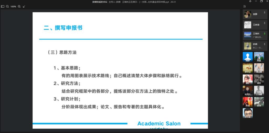 王瑞林老师结合自身成功申报国家社科项目的经验,从选题思路、撰写申报书的框架思路、思路方法和重点难点,以及课题论证阶段的反复修改斟酌等具体环节入手,将具体方法与相关实例相融合,生动详实地介绍分享了自身的科研经验,为广大党员教师后续申报国家社科项目提供了宝贵的经验学习。