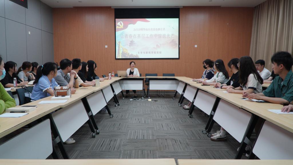 2023年5月16日,9428cn太阳集团古天乐党校对2023届毕业生党员进行了培训,学院党委书记于频带领毕业生党员重温入党誓词,并讲授专题党课——“让青春在基层工作中绽放光芒”。
