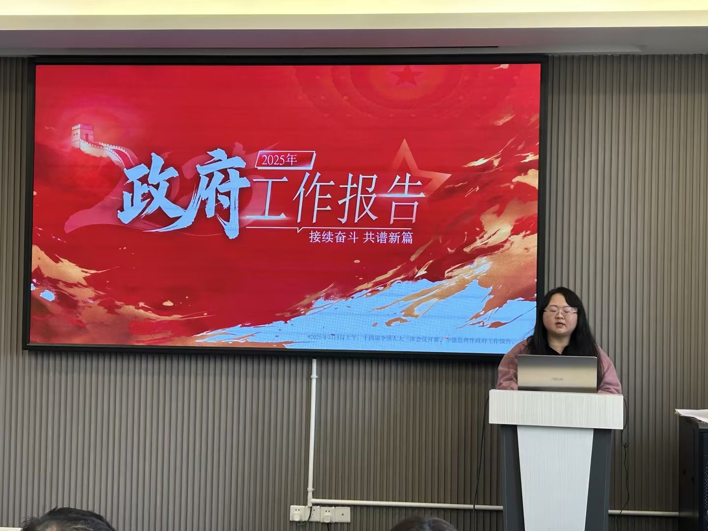 本次党课主题为“2025年政府工作报告:接续奋斗 共谱新篇”,欧婧从“2024年工作回顾”“2025年经济社会发展总体要求和政策取向”“2025年政府工作任务与发展主要预期目标”等方面,对2025年政府工作报告进行了解读。