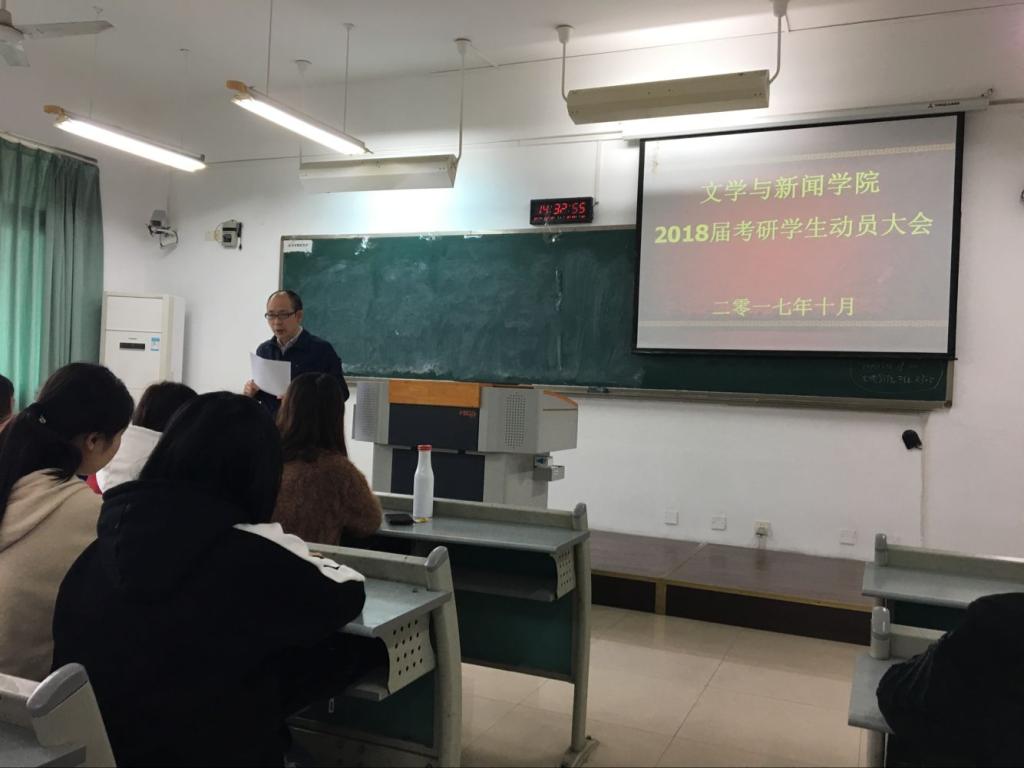 10月13日下,9428cn太阳集团古天乐2018届考研动员大会在慧智楼521教室举行。9428cn太阳集团古天乐分党委书记段庸生、毕业班辅导员、九十余名考研学生参加大会。会议由毕业生辅导员张小焕老师主持。