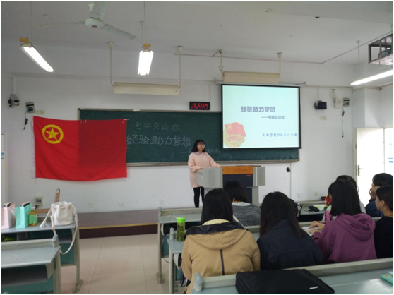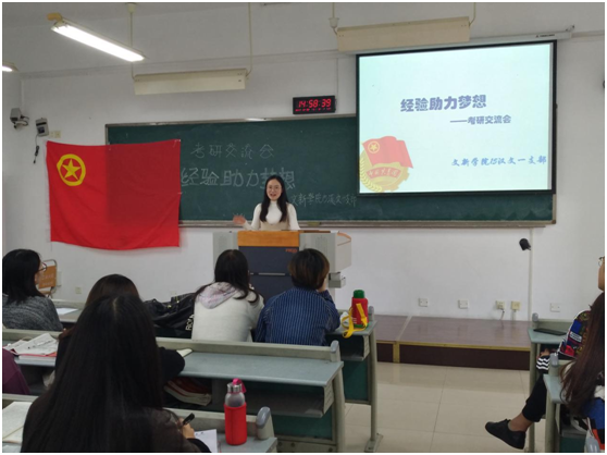 10月20日下午,文新学院2015级汉文一支部“经验助力梦想”考研分享会在慧智楼90622教室成功举办。参加本次分享会的有辅导员杜建清老师,2012级在读研究生胡丁丹、赵宏睿,15级汉文一支部的全体同学。