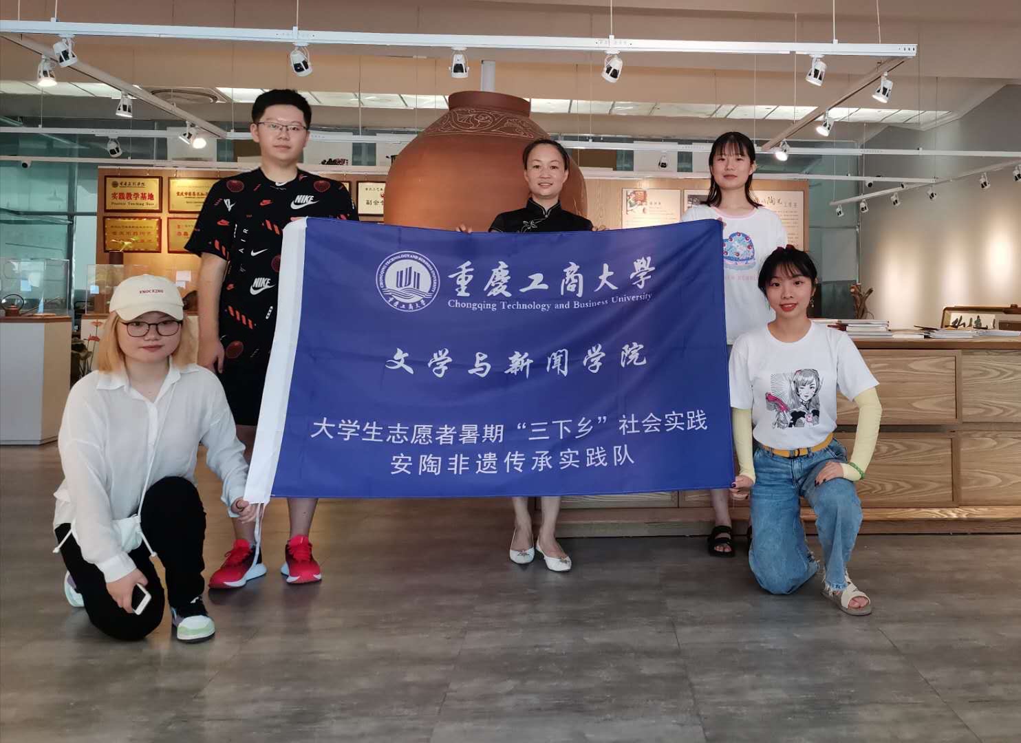 图为实践队全体成员与国家级非遗项目荣昌区代表性传承人、鸦屿陶艺工作室艺术总监梁洪萍的合照