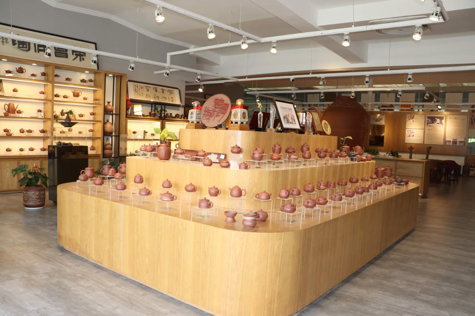 图为工作室里陈列着各种类别的精美的荣昌陶作品以及荣获的各种奖项