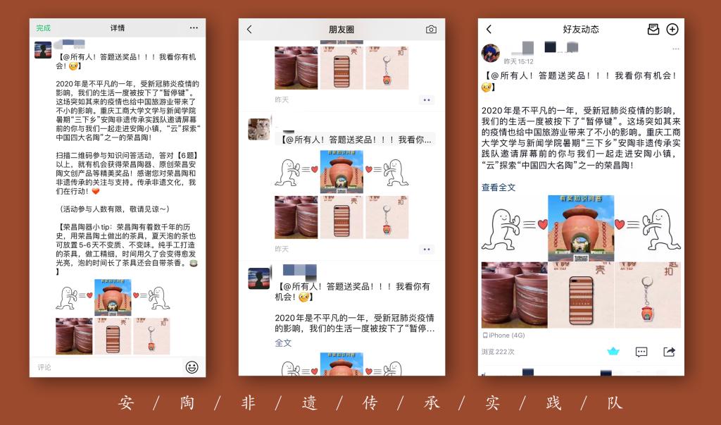 同时,队员们通过朋友圈、QQ空间、微博等新媒体平台将活动分享给身边的人,让更多人了解到“中国四大名陶”之一荣昌陶的魅力,也让更多人有机会参与到非遗文化传承的行动中来。