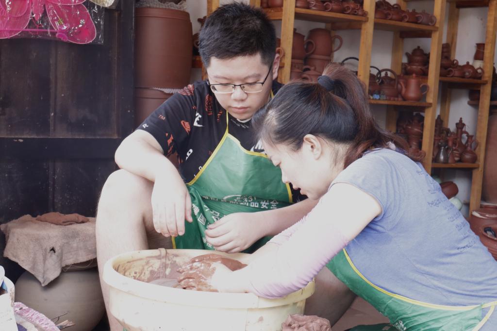 图为在陶宝古街向氏陶艺的小店中,非遗传人向玉寰指导实践队成员进行制作荣昌陶的拉胚定型工序
