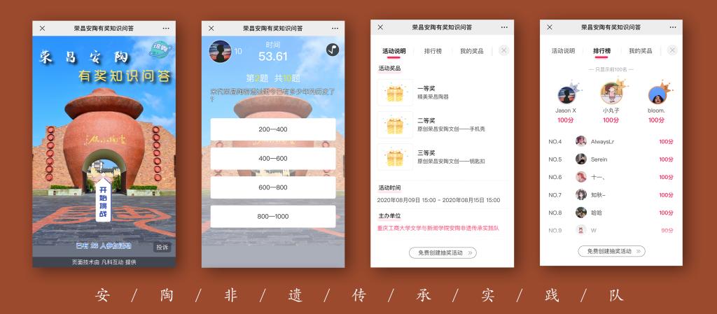 8月8日起,实践队成员们通过线上群聊讨论,策划并制作出了“荣昌安陶有奖知识问答”线上H5答题活动,题目内容包括与荣昌陶、荣昌陶博物馆和安陶小镇等相关的知识,奖品包括精美荣昌陶器、原创荣昌安陶文创产品等,旨在通过这一年轻群体喜爱的方式“云”助力荣昌陶以及非遗文化的推广与传承。